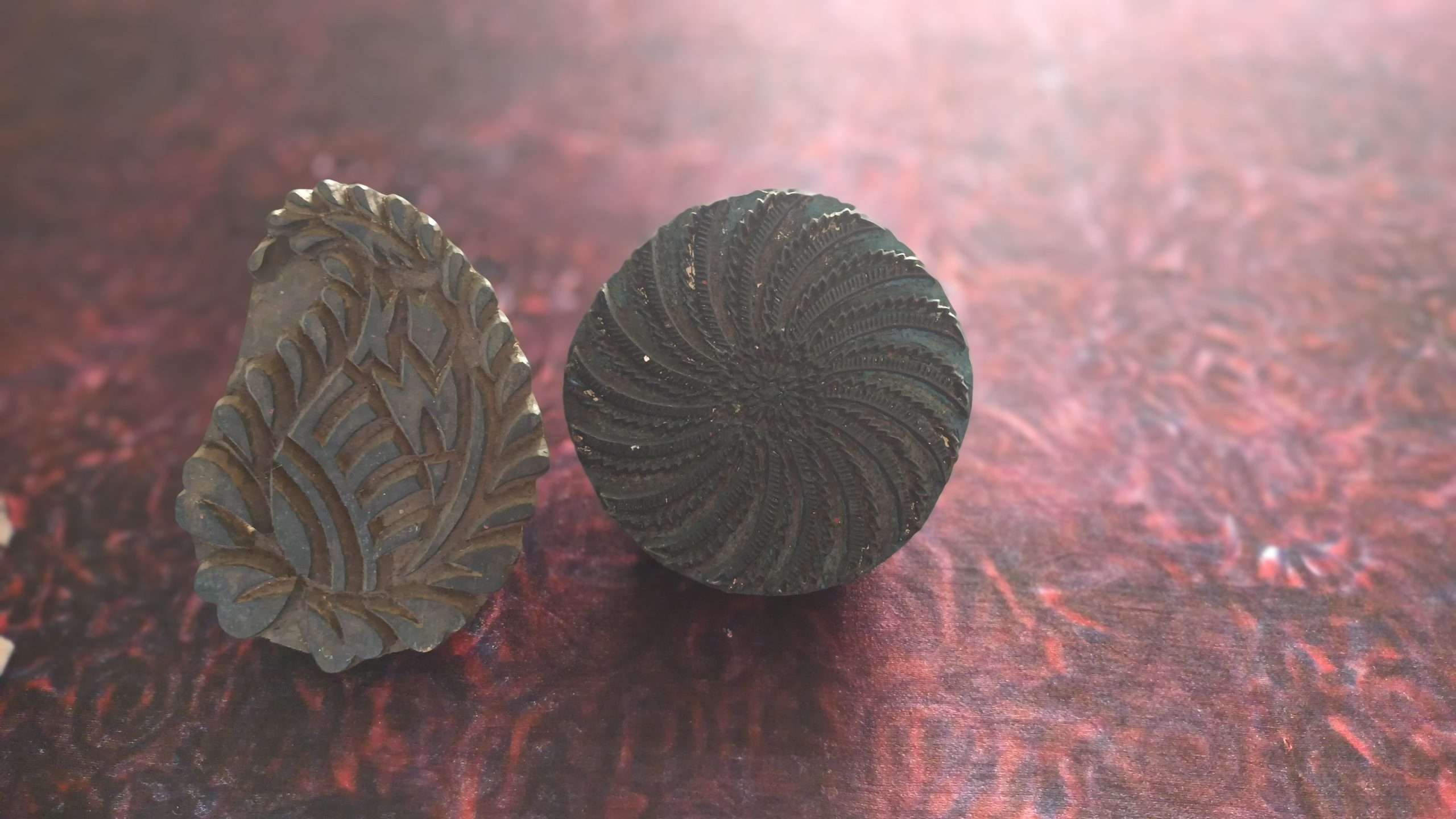 Block-printed textiles include designs made using carved wooden blocks. Carved with precision to create images or designs onto a block of material, typically wood, linoleum, or rubber. The carved block is then inked and pressed onto paper or fabric to transfer the design.